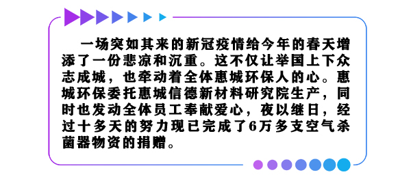 隨后,裝載五萬支殺菌器的車輛啟動(dòng),它將承載全體惠城環(huán)保人的愛心,駛達(dá)最急需的防疫一線。