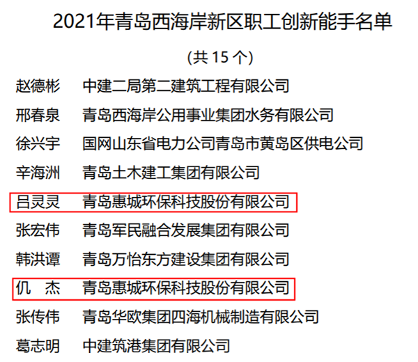 日,青島西海岸新區(qū)總工會(huì)發(fā)布通知,公布“2021年度青島西海岸新區(qū)創(chuàng)新型班組、職工創(chuàng)新能手、職工創(chuàng)新成果”評(píng)選情況,公司工程技術(shù)研究中心榮獲新區(qū)創(chuàng)新型班組殊榮,該部門副主任呂靈靈、副主任工程師仉杰當(dāng)選新區(qū)職工創(chuàng)新能手。