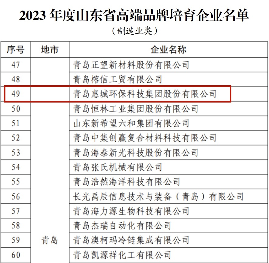 日前,山東省市場(chǎng)監(jiān)督管理局公布了“2023年度山東省高端品牌培育企業(yè)”名單,青島惠城環(huán)保科技集團(tuán)股份有限公司榜上有名。